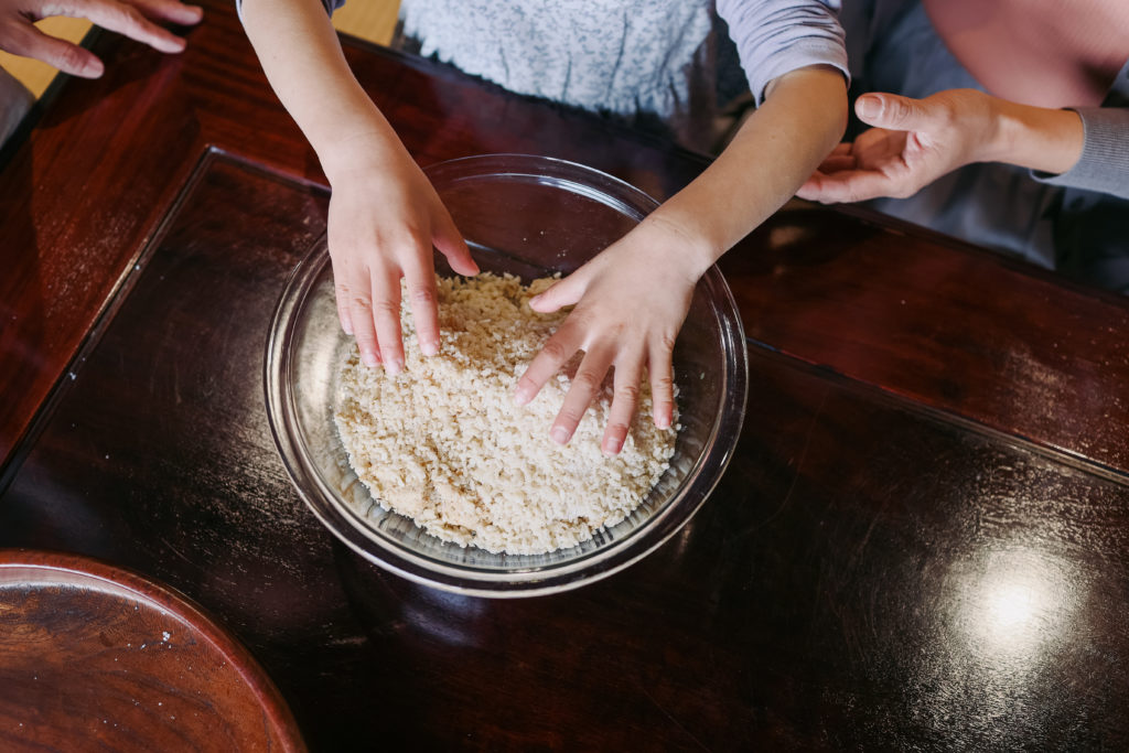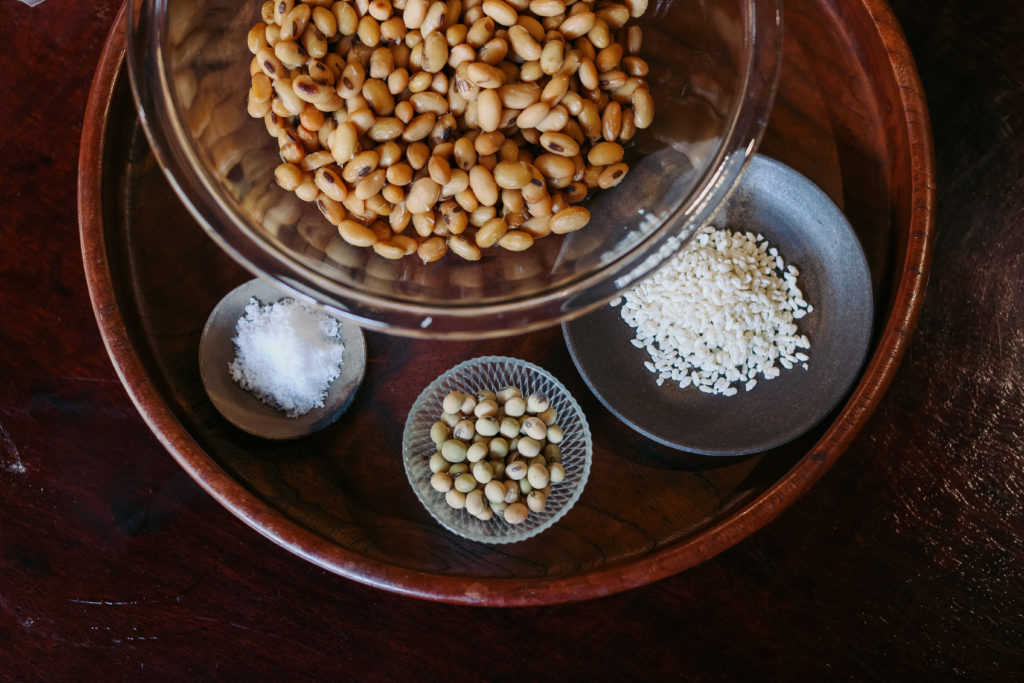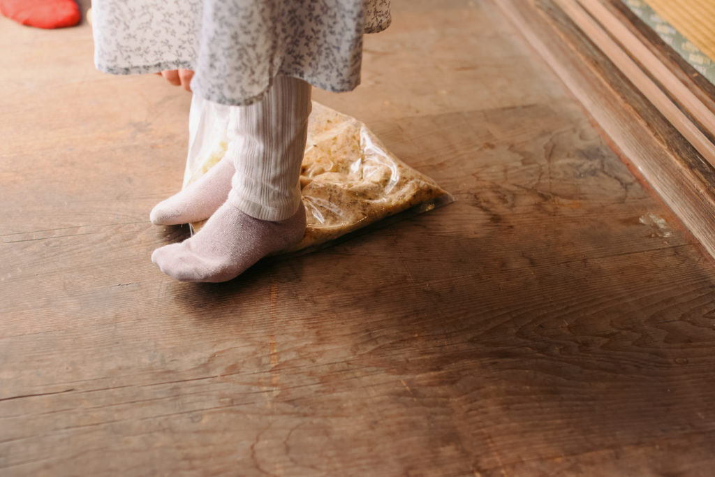 味噌づくりの要は、なんといっても米麹。蒸したお米に麹菌をつけ、丁寧に温度管理をしながら育てていく。麹がしっかりと育つことで、大豆のたんぱく質を分解し、旨みや甘みを引き出してくれます。八百熊川で使っているのは、若狭町で農業をしている保志さんの米麹。米麹のやわらかな甘い香りは、仕込みの時間をやさしく包みます。手で混ぜるときの感触、ほんのりと立ちのぼる香りを感じてみてください。